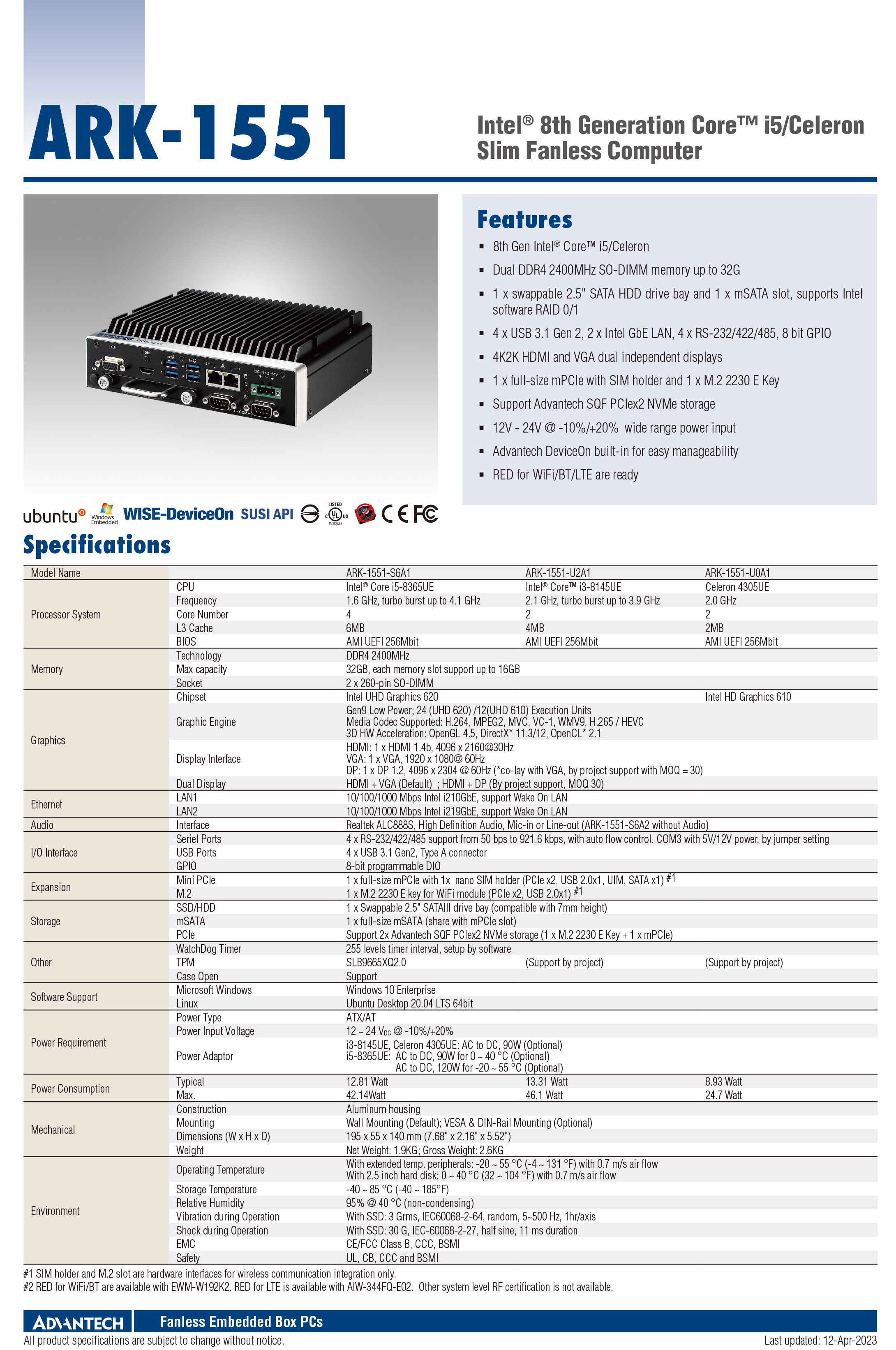 4 × USB 3.1 Gen 2, 2 × Intel GbE LAN, 4 × RS-232/422/485, 8位GPIO