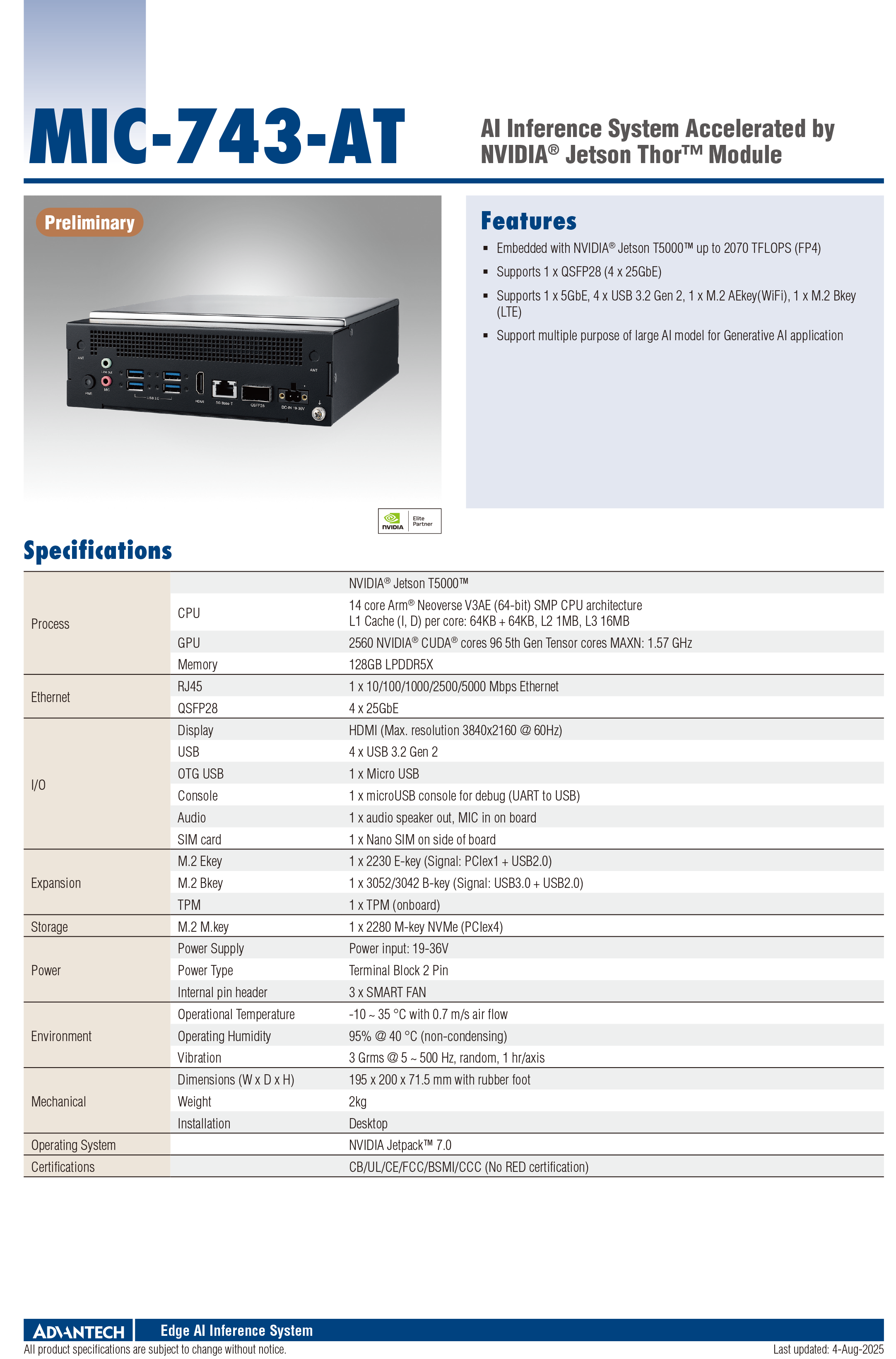 基于 NVIDIA® Jetson T5000™ 算力高达 TFLOPS (FP4)